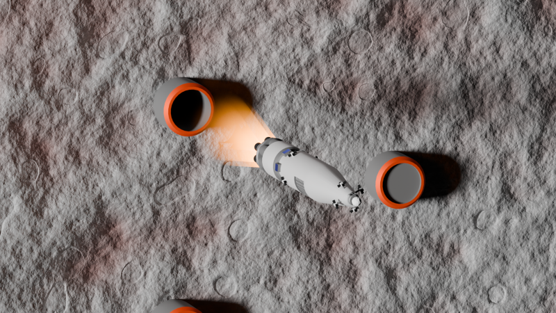 Depicted is an early space combat vessel, outdated even by this time, launching from a hidden silo on the surface of Europa. The engines currently firing represent the boost stage, which would be jettisoned after reaching a stable orbit. In order to drive home just how outdated this spacecraft is for the time, there are no radiators present, indicating the lack of any onboard reactor. Furthermore, although it is concealed by the boost stage, the vehicle is derived from the SLS Exploration Upper Stage, which is currently in development for later missions in the Artemis Program in real life. As such, this spacecraft does not even have a nuclear thermal engine, instead using standard cryogenic chemical rockets for both stages.