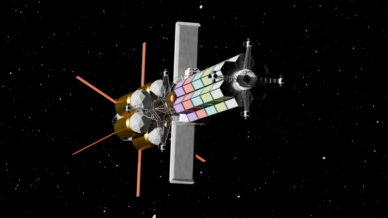 This spacecraft, which unfortunately never received a proper make and model, was one of my most complex Blender projects to date. While surpassed in quality by more recent works, it still represents a multi-day effort to provide a suitable vessel for the protagonists of my (shelved) plotline. Immediately visible are the two centrifuge arms, which provide the crew with a variable level of artificial gravity for long-haul flights between planets in a system. Under thrust, they can fold back to account for the lateral acceleration from the main engines: An array of six Direct Fusion Drives, which also provide the main power for the spacecraft while not emitting copious amounts of radiation like most fusion designs. The glowing panels are the radiators, which in defiance to traditional spacecraft design wisdom do not need to be tapered within a radiation shadow, as the exhaust from the engines is not radioactive.